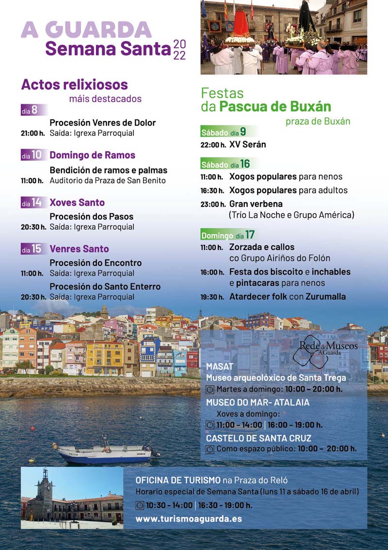 La Oficina de Turismo de Guarda situada en la Plaza del Reloj estará abierta desde el lunes 11 hasta el sábado 16 de abril con un horario más amplio de 10.30 a 14.00 horas y de 16.30 a 19.00 horas. Esta ampliación del horario de atención es gracias a la incorporación del primer informador turístico financiado por la Diputación de Pontevedra. Para cualquier consulta también puede contactar al tel. 986 61 45 46 o turismo@aguarda.es