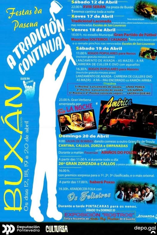 El sábado 30 tendrán lugar los tradicionales juegos populares (11:00 horas para niños y 16:30 horas para adultos) y la posterior fiesta, amenizada por Trío LA NOCHE y GRUPO AMÉRICA (23:00 horas). El día 31 de marzo, Domingo de Resurrección, a partir de las 11:00 horas podrás disfrutar de platos locales como la zorza y ​​los callos acompañado del grupo Airiños do Folón. La tarde está reservada para la tradicional Fiesta de los Bizcochos con hinchables y pintacaras para los niños y como novedad a las 17:00 horas comenzará la subasta de productos tradicionales. El cierre de estas fiestas de Semana Santa de Buxán será a las 19:30 horas con la actuación del grupo folk Os Folieros.
