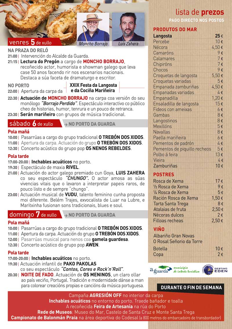 En Allariz deuse a coñecer a programación completa desta XXIX edición da festa gastronómica por excelencia da vila mariñeira da Guarda, que arranca o venres 5 de xullo co Pregón do humorista Moncho Borrajo na Praza do Reló, para despois acudir ao Porto da Guarda, onde procederase á apertura da carpa, celebrarase unha actuación do citado humorista e remate cun serán mariñeiro.