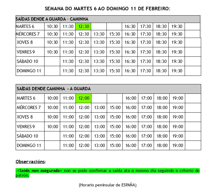 Esta semana as saídas do transbordador veranse afectadas pola marea baixa. Polo tanto, achégase a táboa cos horarios definitivos ata o domingo 11 de febreiro coas saídas confirmadas e aquelas que sofren algunha variación están marcadas.
