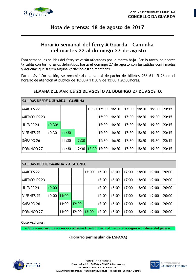 Esta semana las salidas del ferry se verán afectadas por la marea baja. Por lo tanto, se adjunta la tabla con los horarios definitivos hasta el domingo 27 de agosto con las salidas confirmadas y aquellas que sufren alguna variación están marcadas.