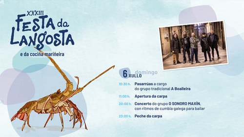 La XXXIII Fiesta de la Langosta y de la Cocina Marinera traspasa el campo gastronómico y tendrá una propuesta musical y lúdica para acercarse a todos los públicos. Habrá pasarrúas durante las tres mañanas de la fiesta con el Grupo de Gaitas de Pensionistas y de la 3ª Edad, o Trebón dos Xidos y A Boalleira, respectivamente.